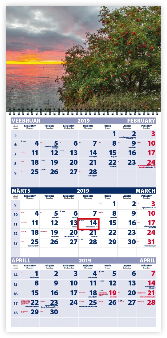 Avatud mõõt koos pildiga 297x630mm. Punane staatiline kuupäevamärkija. Kalendaarium sisaldab riigipühi, riiklikke ja rahvakalendri tähtpäevi, lipupäevi, 42 riigi pühi lühenditena, päikese tõusu ja loojangu aegu, kuu faase, aastaaegade alguseid. Päeva ja kuu nimed eesti ja inglise keeles.